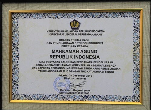 Jakarta – Humas : Mahkamah Agung RI untuk yang kesekian kalinya mendapat penghargaan dari Kementerian Keuangan Direktorat Jenderal Perbendaharaan dalam hal pengelolaan Anggaran Pendapatan Belanja Negara (APBN). Penghargaan yang diterima adalah dalam hal Atas Penyajian Saldo Kas bendahara Pengeluaran pada Laporan Keuangan Kementerian Negara / Lembaga Dan Laporan Pertangungjawaban Bendahara Pengeluaran Tahun Anggaran 2015 Dengan Tingkat Akurasi Tinggi.