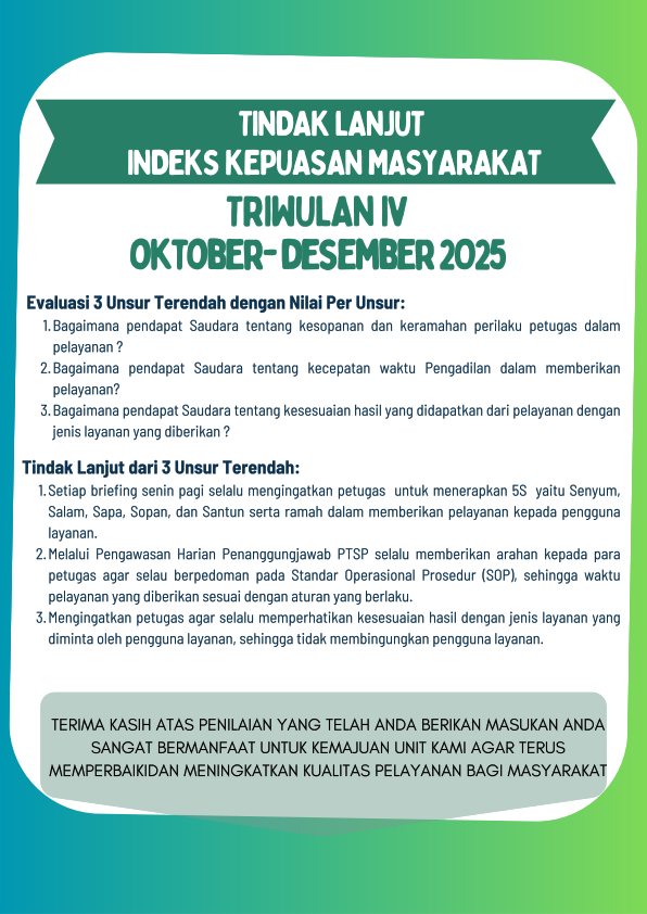 Survey Pelayanan Publik ini dimaksudkan untuk memantau sejauh mana pelaksanaan Surat Keputusan Ketua Mahkamah Agung RI Nomor 026/KMA/SK/II/2012 tentang Standar Pelayanan Peradilan dan juga merupakan bagian dari strategi monitoring dan evaluasi pelayanan publik, sekaligus untuk memetakan situasi pelayanan publik pengadilan dan memberikan rekomendasi perbaikan.