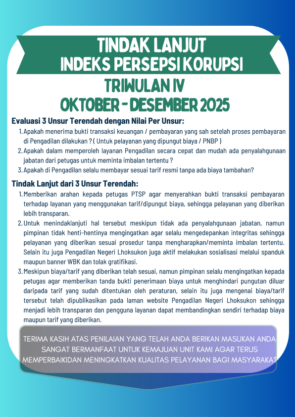Masyarakat pencari keadilan dapat mendapatkan salinan putusan dengan cepat dan mudah dengan mengakses Direktori Putusan Mahkamah Agung RI satuan kerja Pengadilan Negeri Lhoksukon Kelas IB.