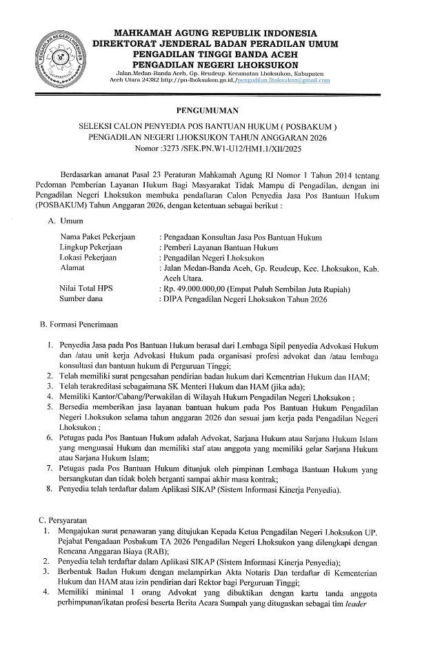 PENGADAAN JASA KONSULTASI POS BANTUAN HUKUM PADA PENGADILAN NEGERI LHOKSUKON TAHUN 2026