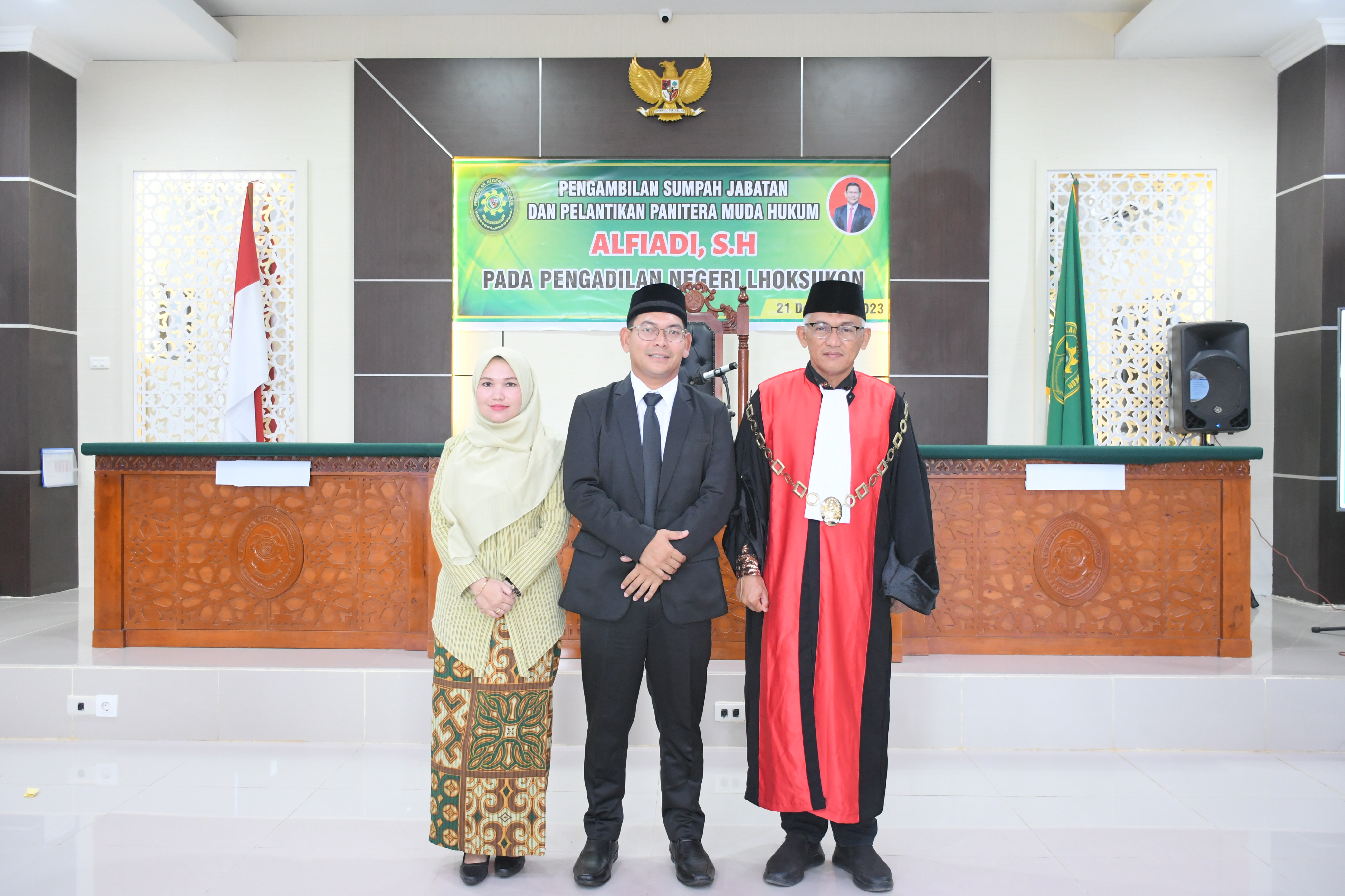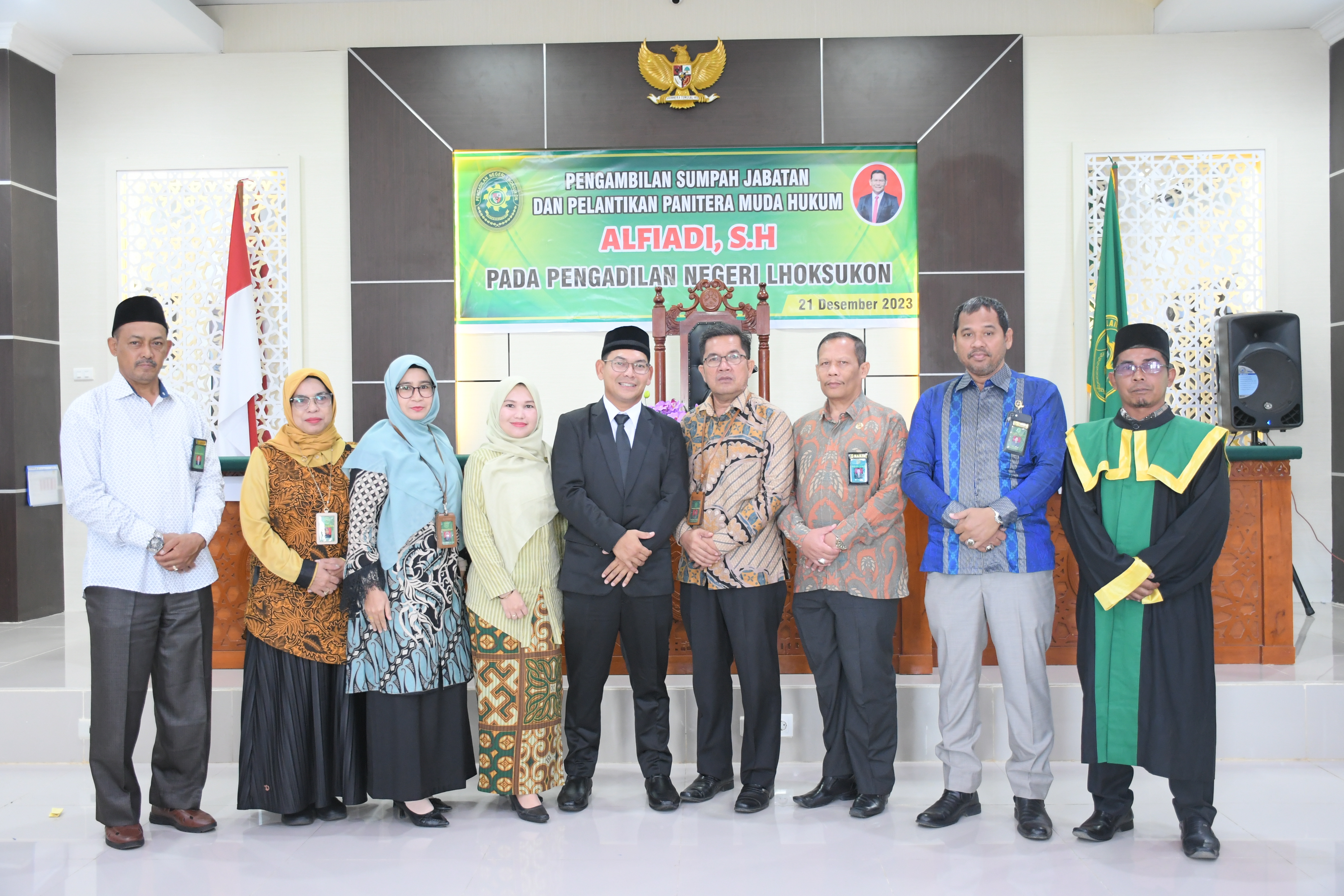 Lhoksukon - Bertempat di ruang Sidang Utama Garuda Pengadilan Negeri Lhoksukon Kelas IB, Kamis (21/12/2023) pada pukul 10.30 WIB Ketua Pengadilan Negeri Lhoksukon Bapak Muhifuddin, S.H., M.H mengambil sumpah dan melantik Bapak Alfiadi, S.H sebagai Panitera Muda Hukum Pengadilan Negeri Lhoksukon.